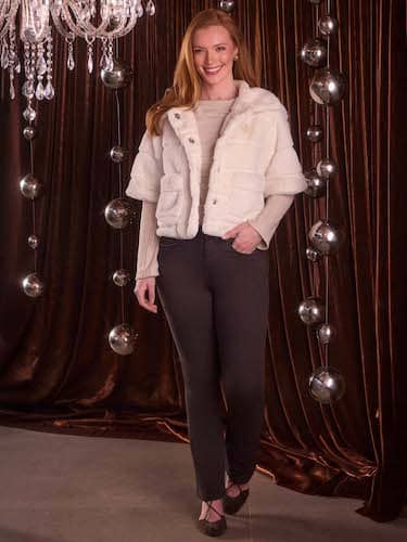 This “life of the party” outfit from their Holiday Collection includes Democracy's signature brown denim itty Bitty Boot Jeans with “Ab” solution fit technology (the back pockets are outlined in rhinestones for some extra holiday sparkle!); and a super-soft wear-anywhere knit top underneath a showstopping cropped faux fur jacket.